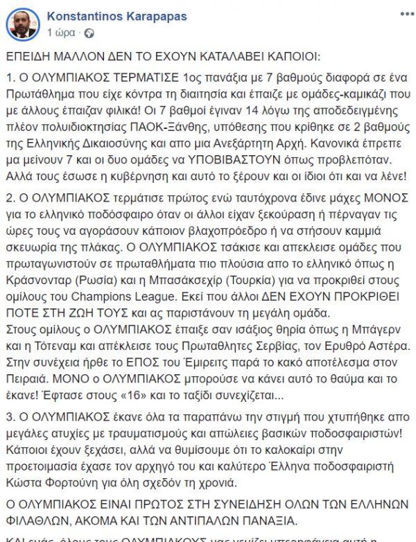 Με μια μακροσκελή ανάρτηση στο facebook ο Κώστας Καραπαπάς έκανε τον δικό του απολογισμό της φετινής σεζόν, υπενθυμίζοντας αγωνιστικά αλλά και εξωαγωνιστικά δεδομένα με τις συγκρίσεις να είναι όλες υπέρ του Ολυμπιακού.