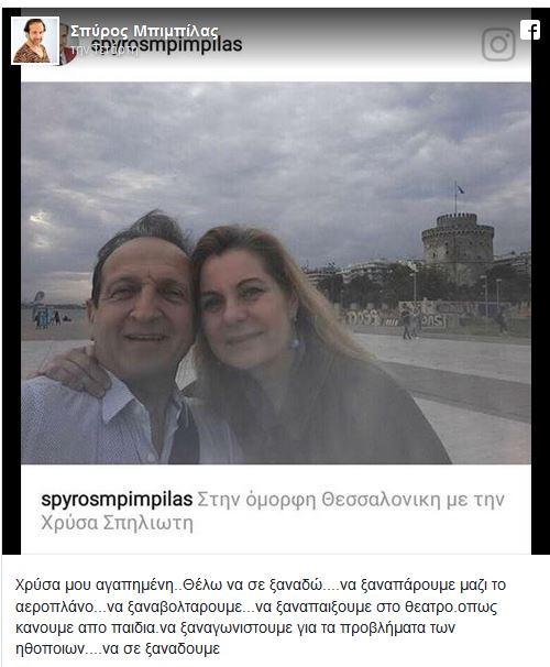 Από την πρώτη στιγμή που έγινε γνωστό ότι η Χρύσα Σπηλιώτη αγνοείται, ο Σπύρος Μπιμπίλας είχε αναρτήσει κοινές τους φωτογραφίες στο Facebook μαζί με την ευχή κι ελπίδα να είναι ζωντανή. Οι δυο τους ήταν καλοί φίλοι και μάλιστα ετοίμαζαν μια παράσταση μαζί για το ερχόμενο φθινόπωρο.