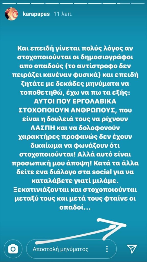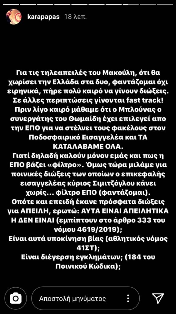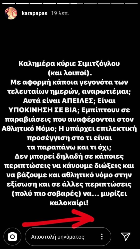 Διαδοχικά ποσταρίσματα στον προσωπικό του λογαριασμό στο ίνσταγκραμ έκανε ο εκ των Αντιπροέδρων της ΠΑΕ Ολυμπιακός, Κώστας Καραπαπάς με αφορμή απειλές και υποκίνηση σε βία.