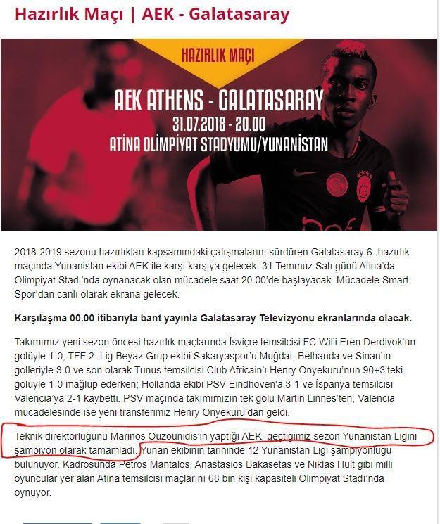 «Ο προπονητής της ΑΕΚ, Μαρίνος Ουζουνίδης, ολοκλήρωσε την τελευταία σεζόν του ελληνικού πρωταθλήματος ως πρωταθλητής», αναφέρει χαρακτηριστικά η Γαλατασαράι.