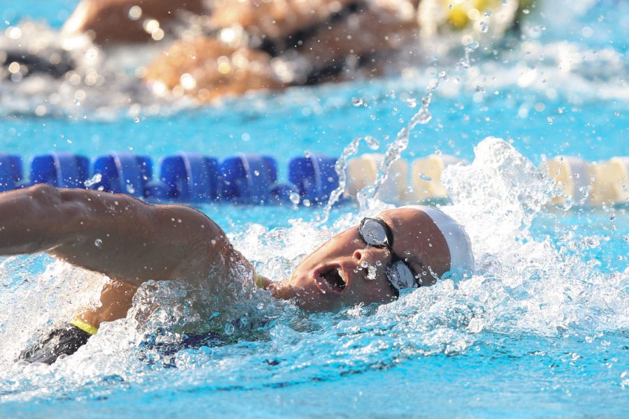 Κολυμβητές-τριες οι οποίοι έχουν ολοκληρώσει την προθέρμανσή τους και αναμένουν την ροή των αγώνων για να συμμετάσχουν στο προσωπικό τους αγώνισμα.