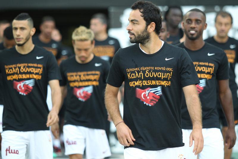 Λίγα λεπτά πριν τη σέντρα στη φιλική αναμέτρηση της ΑΕΚ με τη Γαλατά στο ΟΑΚΑ, οι ποδοσφαιριστές της τουρκικής ομάδας βγήκαν στον αγωνιστικό χώρο έχοντας στα μπλουζάκια του ένα συγκινητικό μήνυμα που δείχνει τη συμπαράστασή τους στον ελληνικό λαό για τα τραγικά γεγονότα των πυρκαγιών της προηγούμενης βδομάδας.