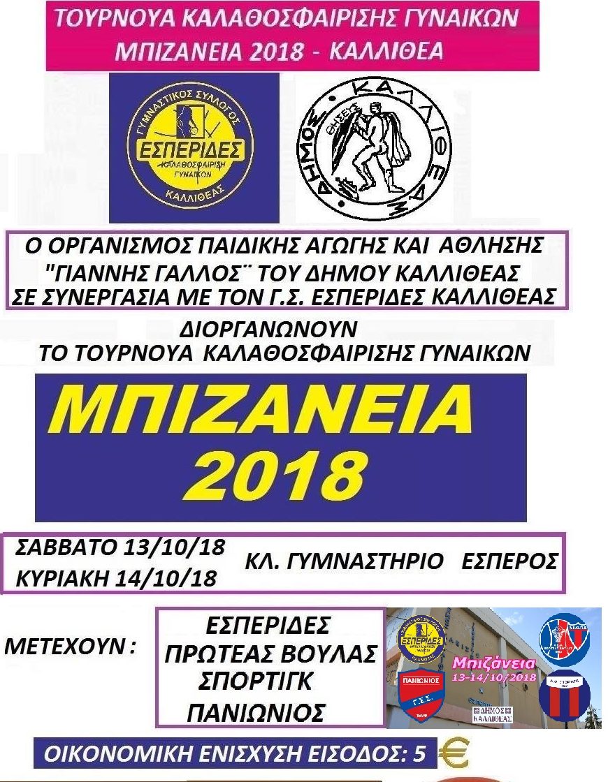 Τουρνουά διοργανώνουν οι Εσπερίδες Καλλιθέας σε συνεργασία με τον οργανισμό παιδικής αγωγής και άθλησης “Γιάννης Γάλλος” (Δήμος Καλλιθέας) 13 και 14 Οκτωβρίου στο κλειστό γυμναστήριο Έσπερος. Στο τουρνουά θα συμμετάσχουν εκτός των Εσπερίδων, Πανιώνιος, Πρωτέας Βούλας, και Σπόρτιγκ. Το τουρνουά θα είναι φιλανθρωπικού χαρακτήρα και θα γίνει για να ενισχυθούν οι πυρόπληκτοι των τελευταίων ημερών.