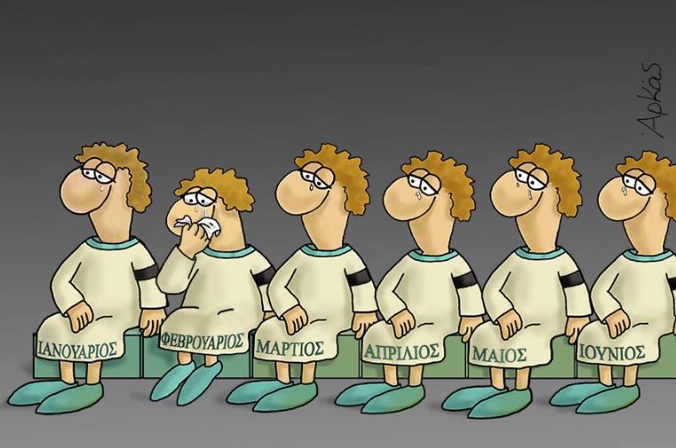 Απέναντί του οι μήνες που προηγήθηκαν, κάθονται επίσης φορώντας μαύρα περιβραχιόνια, δακρυσμένοι, με τον Φεβρουάριο να σκουπίζει τα μάτια του με ένα μαντίλι.