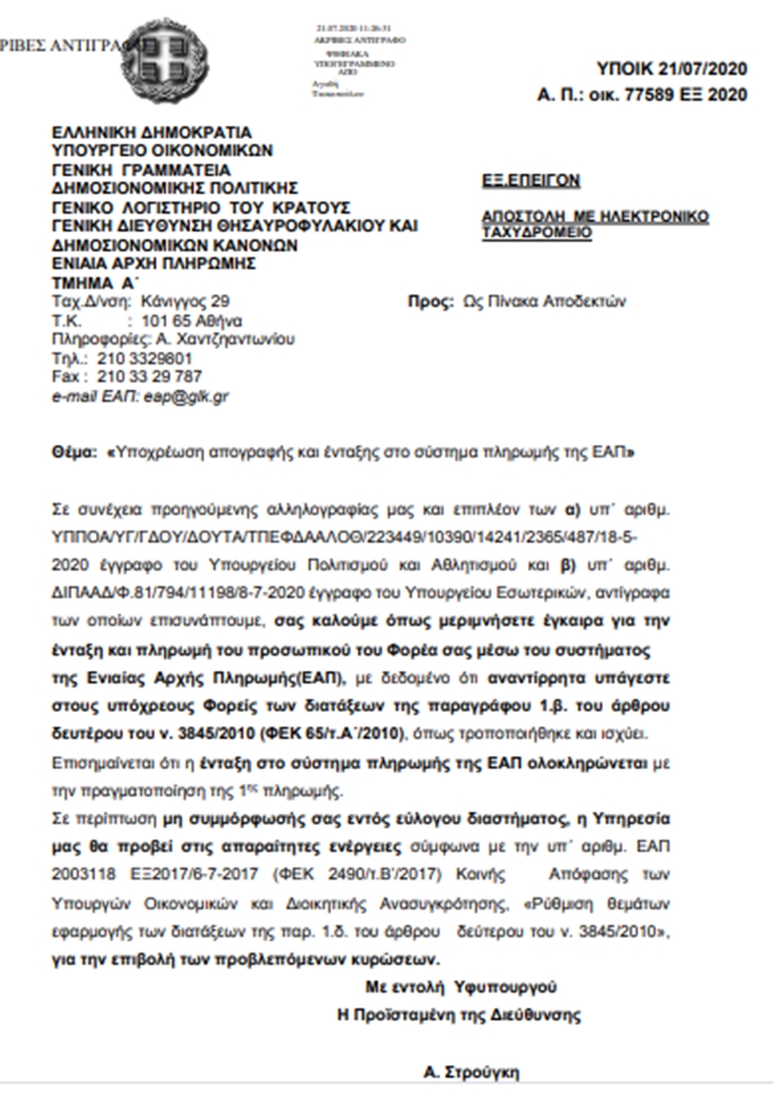 Μάλιστα στην επιστολή, ξεκαθαρίζεται ότι «αναντίρρητα υπάγεστε στους υπόχρεους Φορείς των διατάξεων της παραγράφου 1.β. του άρθρου δευτέρου του ν. 3845/2010 (ΦΕΚ 65/τ.Α΄/2010), όπως τροποποιήθηκε και ισχύει».