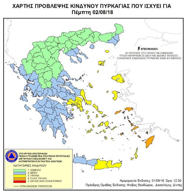 Σύμφωνα με το Χάρτη Πρόβλεψης Κινδύνου Πυρκαγιάς που εκδίδει η Γενική Γραμματεία Πολιτικής Προστασίας του Υπουργείου Εσωτερικών (www.civilprotection.gr), για αύριο Πέμπτη 02 Αυγούστου 2018, προβλέπεται πολύ υψηλός κίνδυνος πυρκαγιάς (κατηγορία κινδύνου 4) για τις εξής περιοχές: