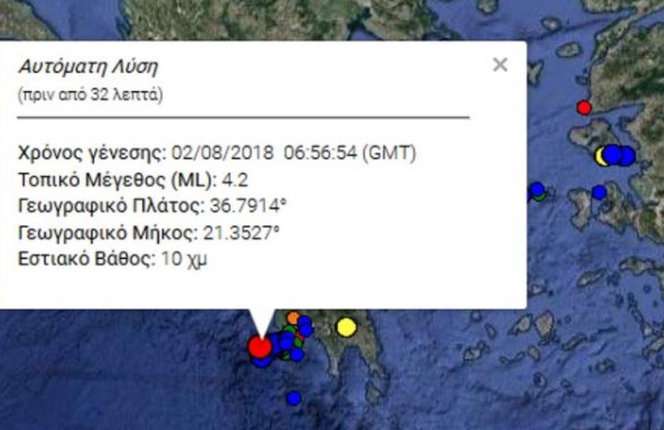 Σεισμός που έγινε αισθητός σε περιοχές της Μεσσηνίας, αλλά και της Ηλείας σημειώθηκε στις 09.56. Σύμφωνα με την αυτόματη λύση του Γεωδυναμικού Ινστιτούτου του Εθνικού Αστεροσκοπείου Αθηνών, ο σεισμός είχε μέγεθος 4,2 βαθμών της κλίμακας Ρίχτερ και το επίκεντρο εντοπίστηκε στην θαλάσσια περιοχή, ανοικτά της Μεθώνης στη Μεσσηνία.
