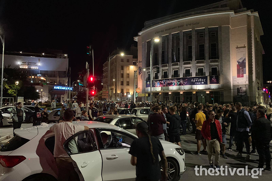Οι καταστηματάρχες συγκεντρώθηκαν στο πλακόστρωτο του Λευκού Πύργου μετά το κλείσιμο των καταστημάτων τους τα μεσάνυχτα για να διαμαρτυρηθούν για το περιορισμένο ωράριο λειτουργίας που έχει επιβληθεί σε νόμους της χώρας, λόγω της πανδημίας.