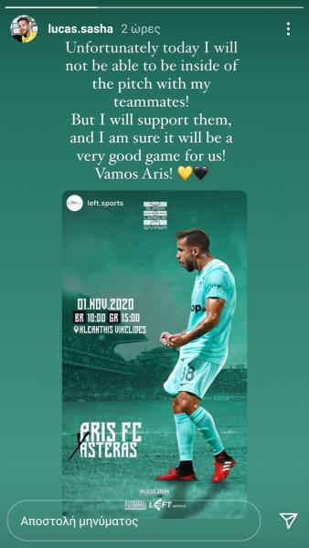 Ο Λούκας Σάσα με ανάρτησή του στον προσωπικό του λογαριασμό στο Instagram τόνισε ότι σήμερα δεν θα μπορέσει να βοηθήσει τον Άρη στον αγώνα με τον Αστέρα Τρίπολης.
