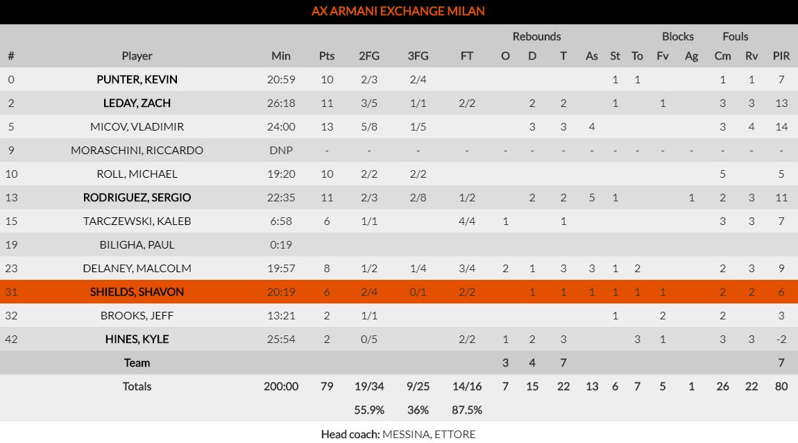 Μεγάλοι πρωταγωνιστές του «διπλού» οι Τζόρνταν Λόιντ (17π.) και Κόρι Ουόλντεν (15π.), ενώ από τους Ιταλούς ξεχώρισε ο Βλάντιμιρ Μίτσοφ με 13 πόντους.