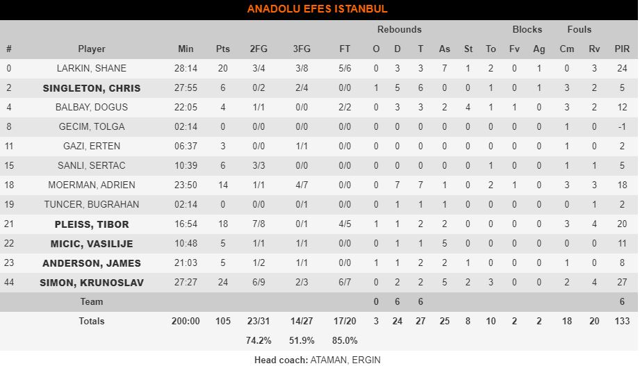 Ολοκλήρωσε το ματς στους 24 πόντους και είχε άξιο συμπαραστάτη τον Λάρκιν που έκανε γεμάτο παιχνίδι με 20 και επτά ασίστ. Οι δύο τους έκαναν… πάρτι στην τρίτη περίοδο και μετέτρεψαν την τέταρτη σε διαδικαστικού χαρακτήρα υπόθεση για να έρθει το τελικό 105-77 υπέρ των Τούρκων.