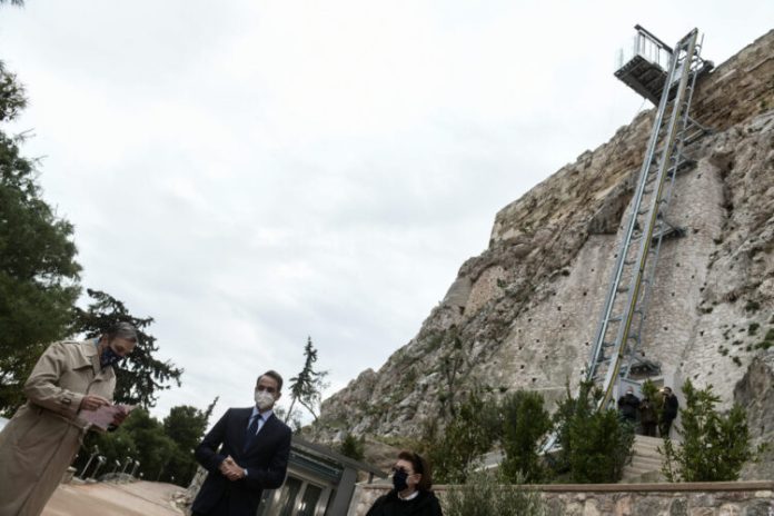Ακολούθως, ο Κυριάκος Μητσοτάκης μαζί με τη Λίνα Μενδώνη και τον Μανώλη Κορρέ εγκαινίασαν τον ανελκυστήρα και περιηγήθηκαν στις νέες διαδρομές της Ακρόπολης.
