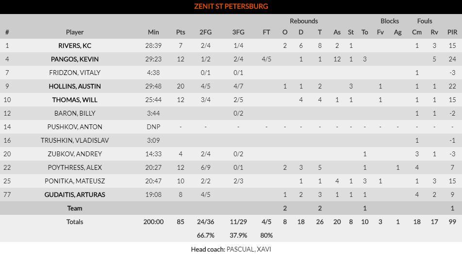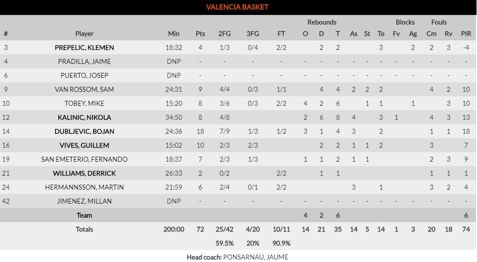Ο Κέβιν Πάνγκος με 12 πόντους και 12 ασίστ κυριάρχησε στο παρκέ, ενώ ο Χόλινς ήταν κομβικός με 20 πόντους. Με διψήφιο αριθμό πόντων ολοκλήρωσαν το ματς οι Τόμας, Πόιθρες και Πονίτκα, την ώρα που για τη Βαλένθια υπήρχε μόνο ο Ντούμπλιεβιτς που πέτυχε 18 πόντους. Σε κακή βραδιά ήταν ο Πρέπελιτς και πολύ άστοχος από τα 6.75μ.