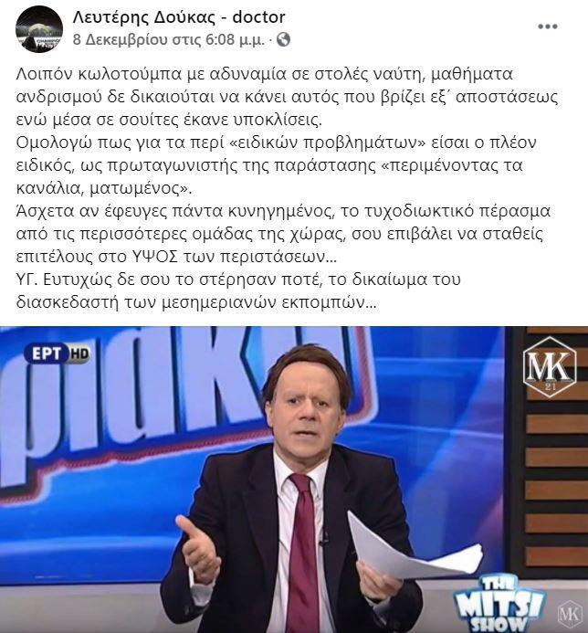 Ο Λευτέρης Δούκας ανέβασε στη σελίδα του στο facebook ένα ποστ που παρότι δεν κατονόμαζε, «φωτογράφιζε» τον Αλέξη Κούγια και συνοδευόταν από μια φωτογραφία του Γιώργου Μητσικώστα, όπου υποδύεται τον πρόεδρο της ΑΕΛ.