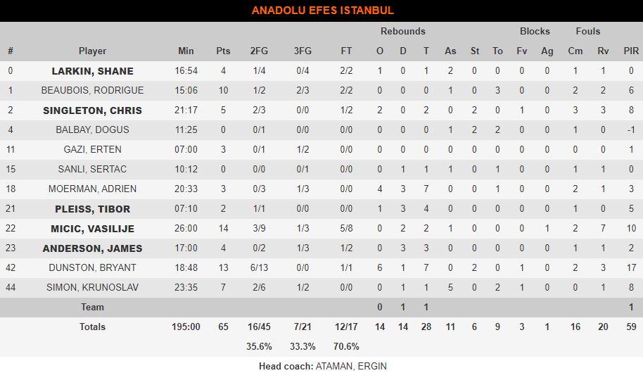 Στην αντίπερα όχθη, η Εφές έβλεπε τον Ντάνστον να προσπαθεί μαζί με τον Μίτσιτς να μαζεύουν τα… ασυμμάζευτα. Ο Λάρκιν ήταν ξανά κακός (4 πόντους, 0/4 τρίποντα) και συνολικά η ομάδα του Αταμάν γνώρισε έναν ανεπανάληπτο διασυρμό.