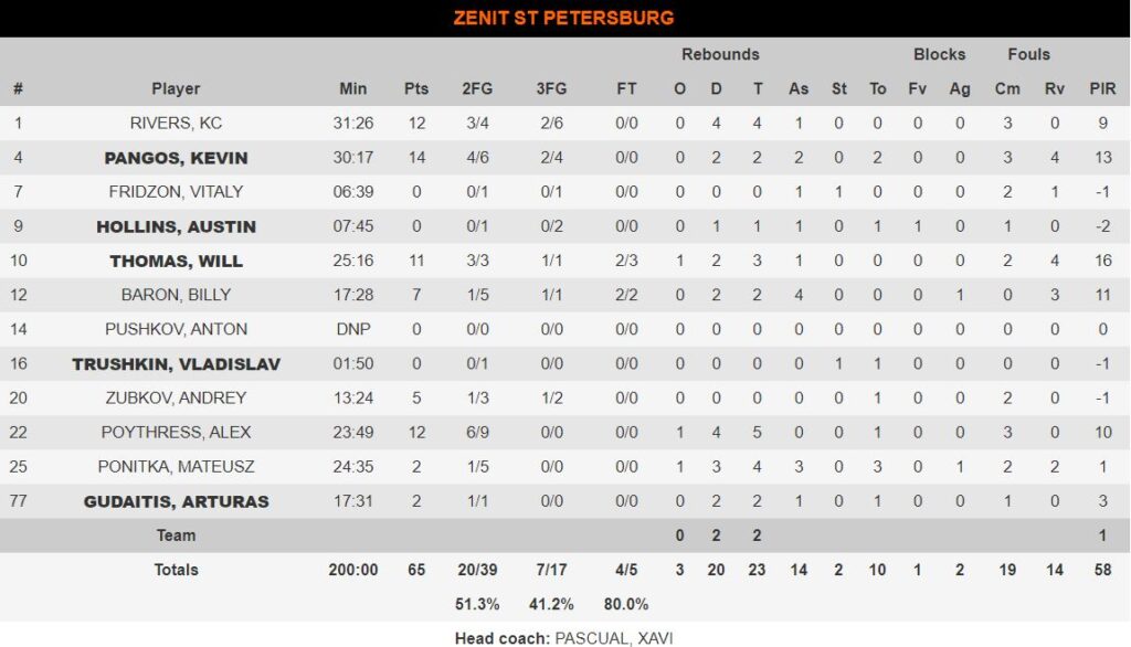 Για τη Ζενίτ ξεχώρισε εκτελεστικά ο Πάνγκος με 14 πόντους, ενώ από 12 είχαν ο Ρίβερς και ο εκρηκτικός στη ρακέτα, Πόιθρες.