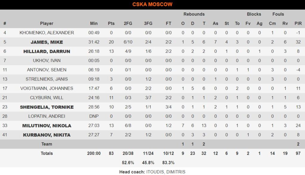 Κορυφαίοι για την «αρκούδα» ήταν οι… γνωστοί-άγνωστοι. Ο Μάικ Τζέιμς σταμάτησε στους 20 πόντους και μοίρασε επτά ασίστ, ενώ ο Μιλουτίνοφ έκανε ξανά double double με 13 πόντους και 13 ριμπάουντ. Τόσους πόντους είχε και ο Χίλιαρντ, ενώ Κλάιμπερν και Σενγκέλια είχαν 11 και 10 αντίστοιχα.