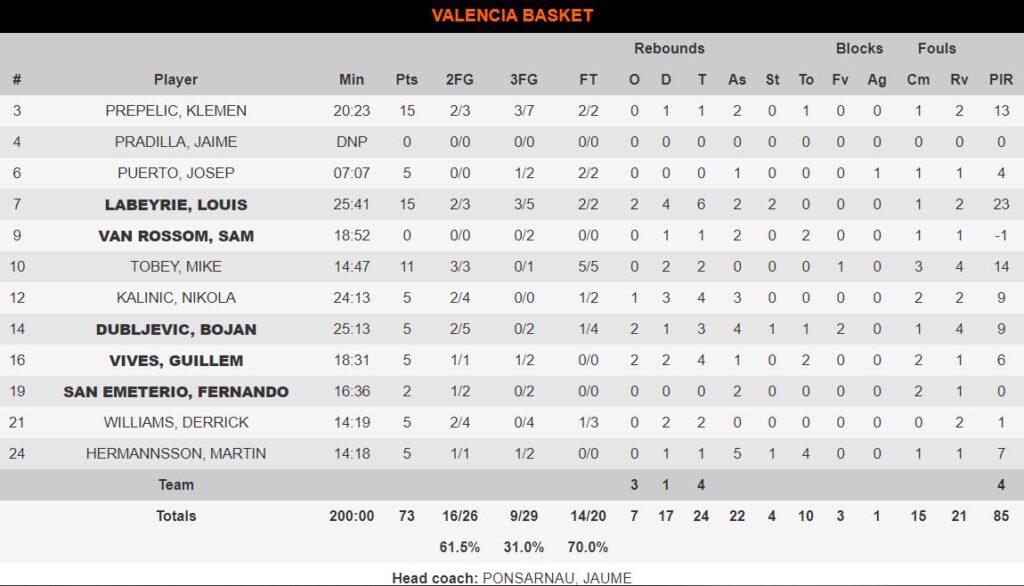 Ο Λαμπεϊρί έπαιζε μόνος του ειδικά στο δεύτερο ημίχρονο και προσπαθούσε να… αφυπνίσει τους συμπαίκτες του. Συνολικά είχε 15 πόντους και μάζεψε έξι ριμπάουντ, με τον Τόμπι να έχει 11 (χωρίς τρίποντο) και τον Πρέπελιτς 15 με 3/7.