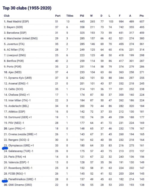 Η λίστα αυτή είναι μια κατάταξη με τις καλύτερες ομάδες στο Κύπελλο Πρωταθλητριών και το UEFA Champions League φυσικά από το 1955 μέχρι το 2020. Οι Πειραιώτες πλασάρονται στην 23η θέση, πάνω από ομάδες όπως οι Σίτι, η Ρόμα, η Μονακό, η Μπάγερν Λεβερκούζεν, η Μαρσέιγ και η Σεβίλλη.
