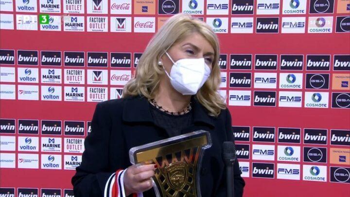 Η κ. Καμπισιούλη μετά τη βράβευσή της – στο πλαίσιο του Monday’s Game Nights Against COVID στην αναμέτρηση του Ολυμπιακού με τη Mega Soccerbet – υποστήριξε στην κάμερα της ΕΡΤ πως είναι Ολυμπιακός.