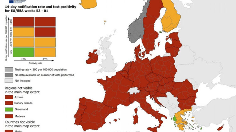 Εκτός από την Ελλάδα, την Φινλανδία και την Ισλανδία, που είναι χρωματισμένες «πορτοκαλί» όλη η υπόλοιπη Ευρώπη βρίσκεται στο «κόκκινο», δηλαδή καταγράφονται πάνω από 150 κρούσματα ανά 100.000 πληθυσμού.