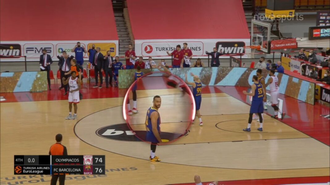 Στην τελευταία επίθεση των Ερυθρόλευκων μάλιστα, ο Χάνγκα έκανε φάουλ στον Σπανούλη, οι διαιτητές δεν έδειξαν την παράβαση και ο παίκτης της Μπαρτσελόνα σήκωσε το χέρι και κοίταξε απορημένος.