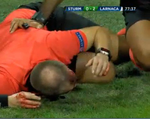 Απίστευτη εξέλιξη στην Αυστρία, στο παιχνίδι της Στουρμ Γκρατς απέναντι στην ΑΕΚ Λάρνακας. Στο 79ο λεπτό του αγώνα και ενώ η ομάδα της Κύπρου ήταν μπροστά στο σκορ με 0-2, ένας εξαγριωμένος οπαδός των γηπεδούχων εκσφενδόνισε ένα γυάλινο μπουκάλι μπύρας το οποίο πέτυχε τον βοηθό στο κεφάλι! Εκείνος έπεσε αιμόφυρτος στον αγωνιστικό χώρο, με τα ιατρικά τιμ των δύο ομάδων να τρέχουν απευθείας πάνω του, αφού φάνηκε να χάνει τις αισθήσεις του. Το διαιτητικό τρίο έχει αποσυρθεί στα αποδυτήρια και είναι άγνωστο αν η αναμέτρηση θα συνεχιστεί.