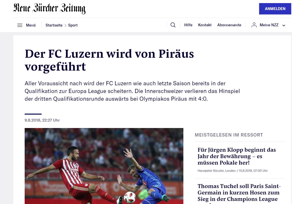 «Έχασε τον παράδεισο η Λουκέρνη στον Πειραιά», σημειώνεται στον τίτλο της ιστοσελίδας nzz, όπου γίνεται η ίδια επισήμανση με τα υπόλοιπα ελβετικά ΜΜΕ: «Οι ελπίδες ότι ο Ολυμπιακός είναι μια νέα ομάδα και με πολλούς καινούργιους παίκτες και θα μπορέσει τον κοντράρει η Λουκέρνη… πέθανε στα πρώτα λεπτά του αγώνα».