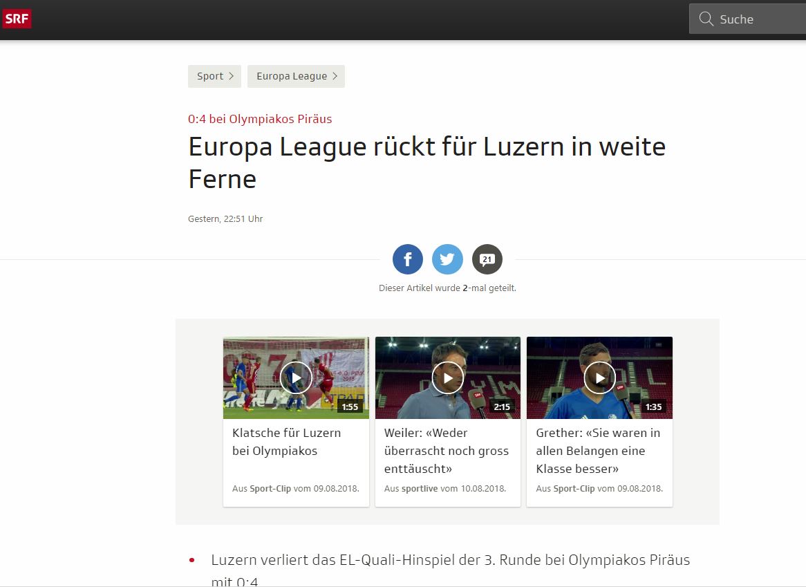 «Μακρινό παρελθόν το Europa League για τη Λουκέρνη», είναι ο τίτλος στην ιστοσελίδα της κρατικής ραδιοφωνίας και τηλεόρασης της Ελβετίας, SRF.