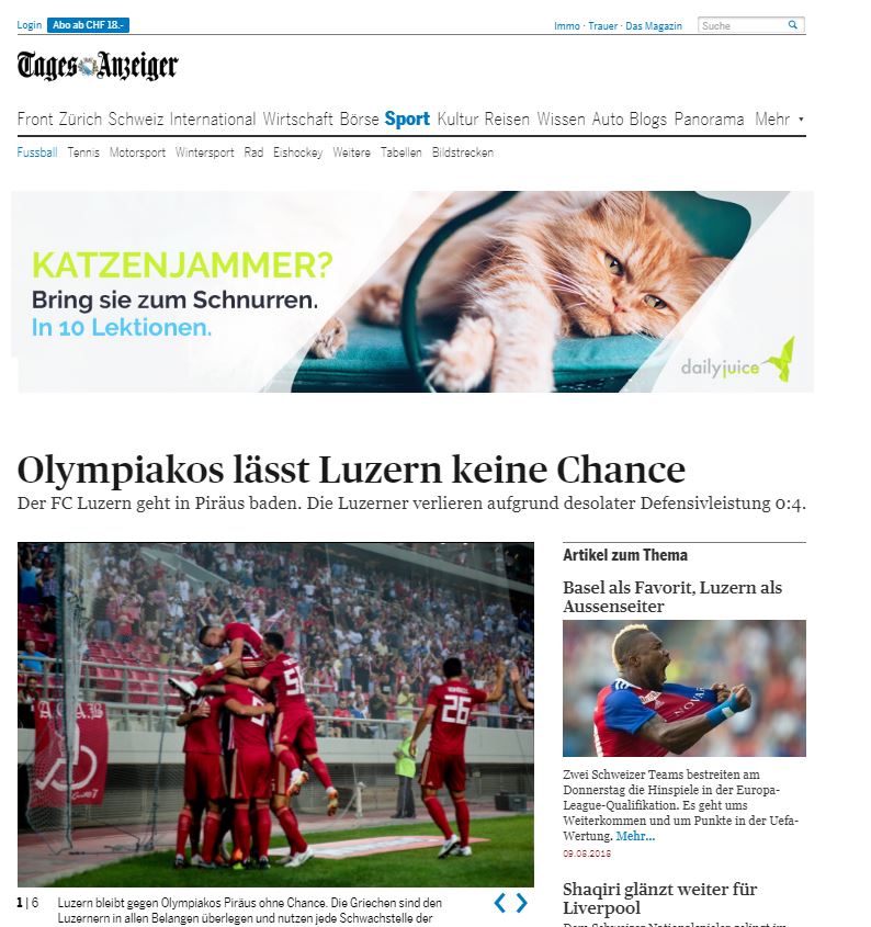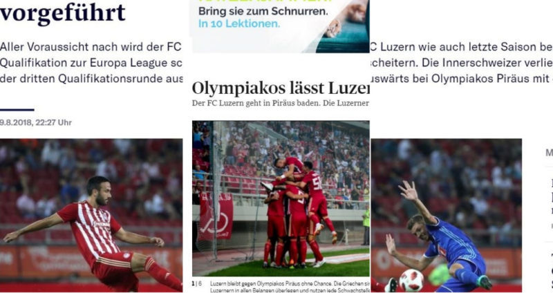 «Ο Ολυμπιακός δεν άφησε στην Λουκέρνη καμία πιθανότητα», είναι ο τίτλος στην ιστοσελίδα tagesanzeige, που επισημαίνει ότι «πνίγηκε στα βαθιά η Λουκέρνη» και πως «φάνηκε η έλλειψη διεθνής εμπειρίας».