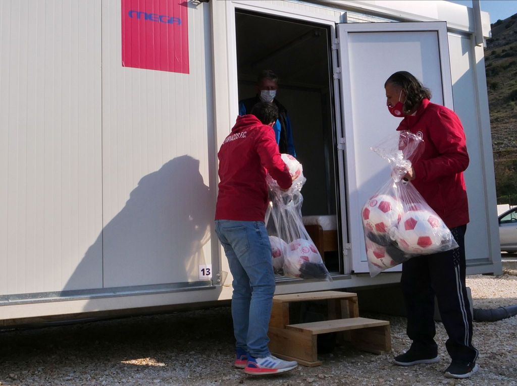 Αυτή τη φορά, δωρίστηκαν επιπλέον μπάλες, παπούτσια και αθλητικός ρουχισμός στην τοπική ομάδα Δαμασιακό με τον Ολυμπιακό να συμβάλει και πάλι με είδη πρώτης ανάγκης, καθαρισμού κτλ.