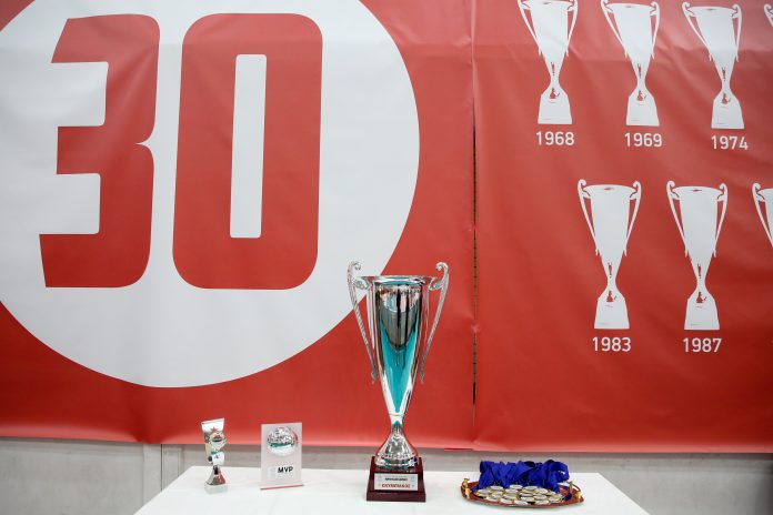 Το κλειστό του Ρέντη είναι… ντυμένο με ένα τεράστιο ερυθρόλευκο πανό όπου αναγράφονται τα 30 πρωταθλήματα του συλλόγου, ενώ ήδη έχει πάρει θέση στο γήπεδο το Κύπελλο του πρωταθλητή.