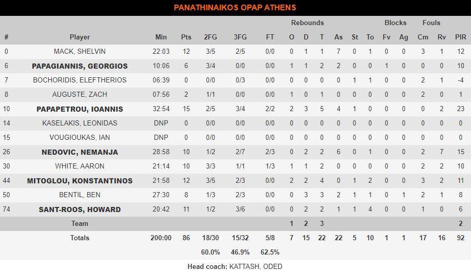 Η ομάδα του Όντεντ Κάτας ολοκλήρωσε το παιχνίδι με 15/32 τρίποντα και 60% στο δίποντο, με τον Παπαπέτρου να έχει 15 πόντους και τους Μήτογλου – Μακ από 12.