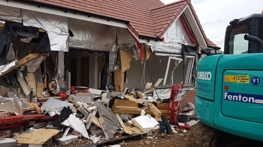 Πέντε νεόδμητα μπάνγκαλοους που περίμεναν τους ιδιοκτήτες τους για να κατοικηθούν, μετατράπηκαν σε σωρούς από ερείπια, από οργισμένο οικοδόμο που δεν είχε πάρει τα λεφτά που τού όφειλαν οι ιδιοκτήτες τους.