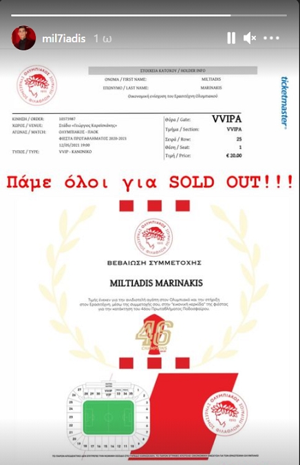 «Πάμε όλοι για sold out!» έγραψε ο Μιλτιάδης Μαρινάκης στα social media, ανεβάζοντας το αποδεικτικό του εισιτηρίου και καλώντας τον λαό του Ολυμπιακού να κάνει το καθήκον του.