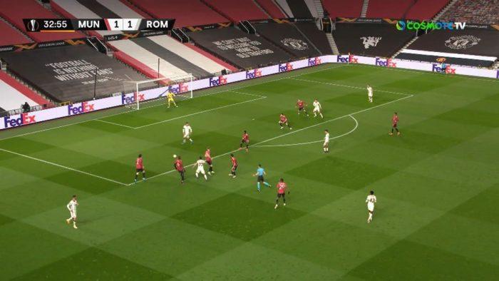 Ωστόσο, η χαρά των «κόκκινων διαβόλων» κράτησε μόλις έξι λεπτά, καθώς στο 15′ η Ρόμα ισοφάρισε σε 1-1, όταν ο Πελεγκρίνι εκτέλεσε εύστοχα το πέναλτι που κέρδισαν οι «ροσονέρι» για χέρι του Πογκμπά.