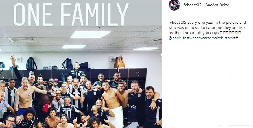 «Όλοι όσοι είναι σε αυτή τη φωτογραφία και οι υπόλοιποι στη Θεσσαλονίκη είναι σαν αδέρφια μου. Είμαστε εδώ για να γράψουμε ιστορία», ήταν το μήνυμά του κεντρικού αμυντικού των ασπρόμαυρων.