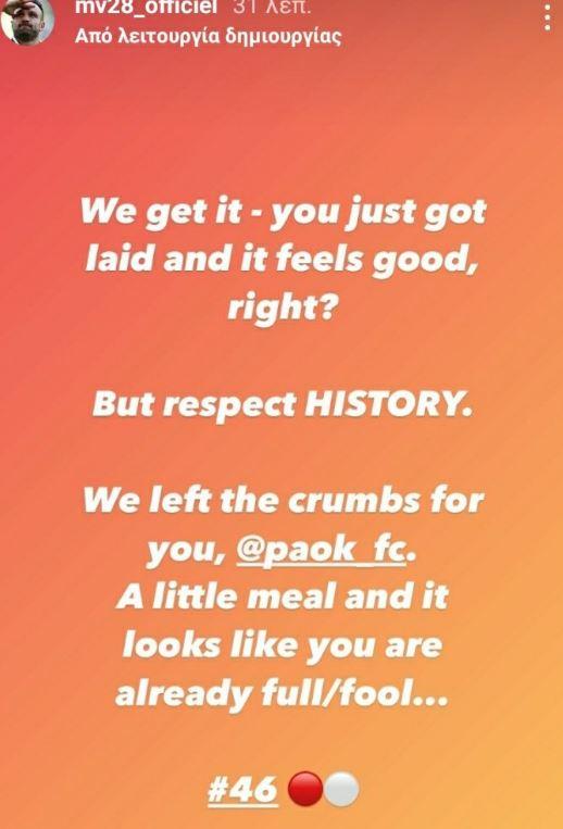 Ο Ματιέ Βαλμπουενά δεν άφησε ασχολίαστα τα όσα έγιναν και μέσω ίνσταγκραμ απάντησε με τον δικό του τρόπο, απευθυνόμενος στον ΠΑΟΚ: «Σεβαστείτε την ΙΣΤΟΡΙΑ. Αφήσαμε τα ψίχουλα για σένα, ΠΑΟΚ. Ένα μικρό γεύμα και μοιάζεις ήδη γεμάτος – βλάκας (full/fool)», ανέφερε μεταξύ άλλων ο Γάλλος μεσοεπιθετικός ως «απάντηση» στους ανθρώπους του ΠΑΟΚ (παίκτες και Πάμπλο Γκαρσία) που έσπευσαν να «επιτεθούν» σε Βαγγέλη Μαρινάκη και σύλλογο.