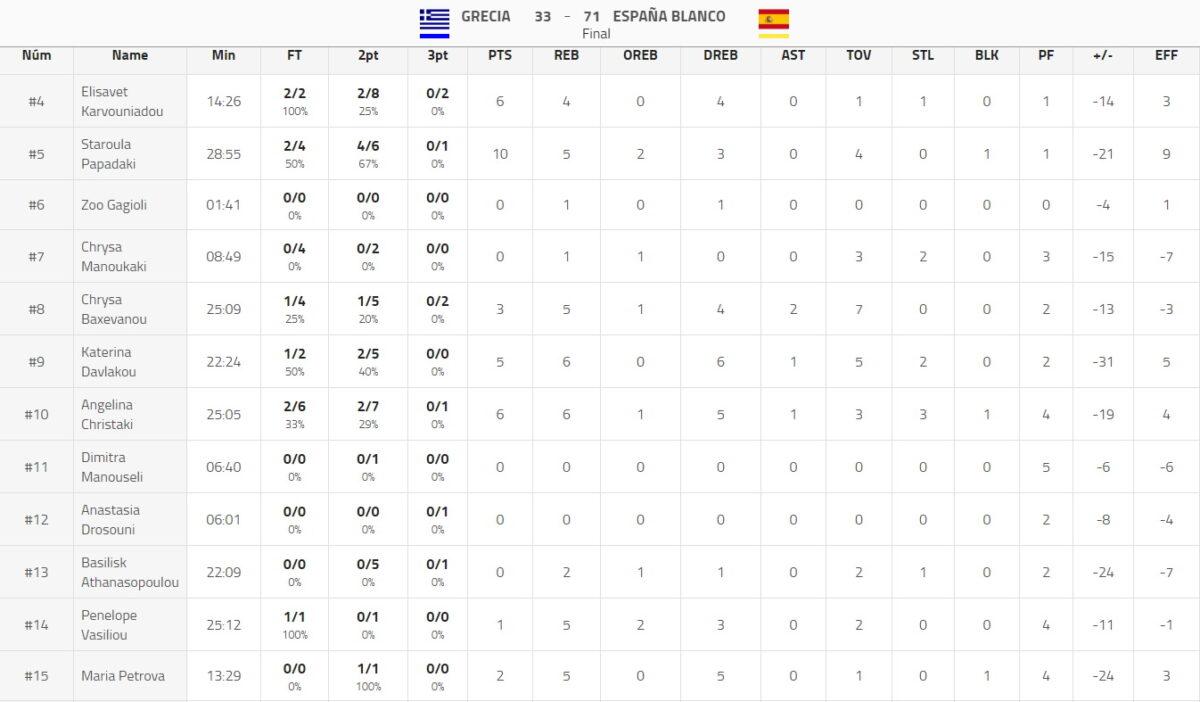 Ελλάδα (Γκογκάκης): Καρβουνιάδου 6, Παπαδάκη 10, Γκατζιώλη, Μανουκάκη, Μπαξεβάνου 3, Δαυλάκου 5, Χρηστάκη 6, Μανουσέλη, Δροσούνη, Αθανασοπούλου, Βασιλείου 1, Πέτροβα 2.