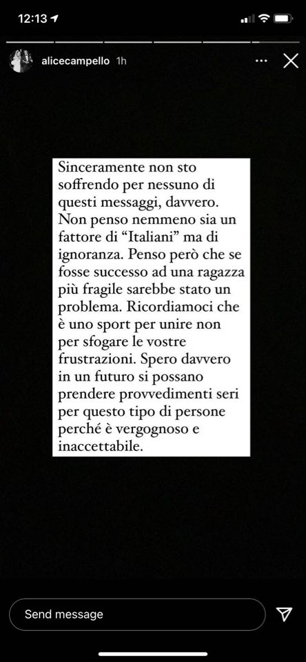 «Ειλικρινά, δεν υποφέρω με κανένα από αυτά τα μηνύματα. Δεν νομίζω ότι είναι χαρακτηριστικό των «Ιταλών», αλλά της άγνοιας. Αλλά νομίζω ότι αν είχε συμβεί σε ένα πιο ευαίσθητο κορίτσι θα ήταν πρόβλημα. Ας θυμηθούμε ότι είναι ένα άθλημα για να ενωθούμε και να μην σας ξεπερνούν οι απογοητεύσεις σας.