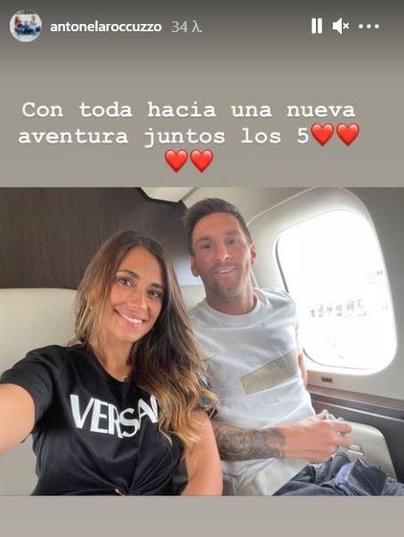 Ποστάροντας μια φωτογραφία με τον Μέσι στην πτήση με προορισμό το Παρίσι, η Αντονέλα έγραψε «Μαζί και οι 5 προς μια νέα περιπέτεια».