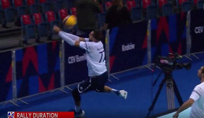 Ο διεθνής ακραίος έβγαλε αδιανόητα την άμυνα με κίνδυνο τραυματισμού και μάλιστα στη συνέχεια της φάσης τελείωσε ιδανικά τη φάση για να δώσει τον πόντο στην Ελλάδα.