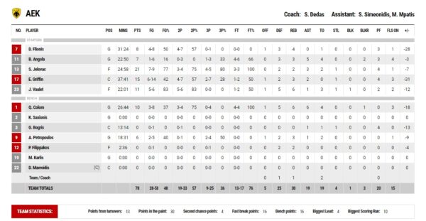 H AEK πήγε στο ΣΕΦ προετοιμασμένη να δώσει μάχη και κατάφερε να μην αφήσει τον Ολυμπιακό να έχει εύκολο απόγευμα. Από νωρίς φάνηκαν οι διαθέσεις των παικτών του Δέδα να πιέσουν τους ερυθρόλευκους και να διεκδικήσουν ότι μπορούν από αυτόν τον αγώνα.