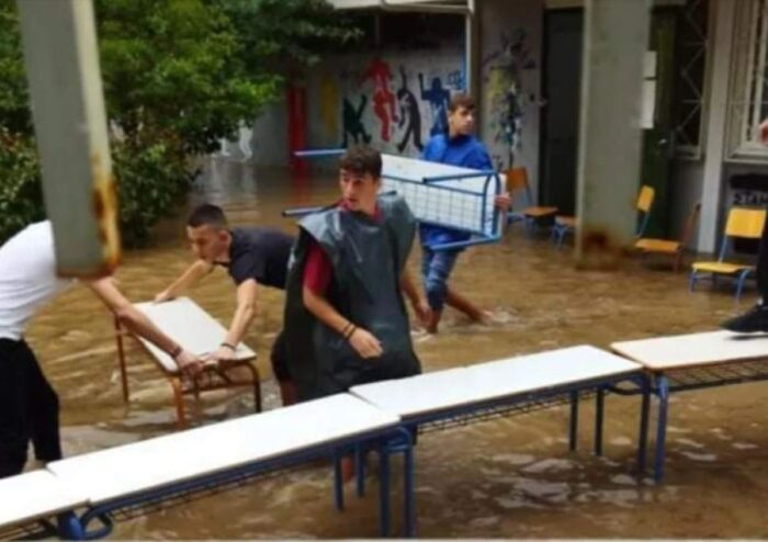 Στη Νέα Φιλαδέλφεια πλημμύρισε το σχολικό συγκρότημα της οδού Εφέσου, όπου μαθητές του 1ου Γυμνασίου – Λυκείου αναγκάστηκαν να φτιάξουν… γέφυρα με θρανία για να βγουν από τις τάξεις.
