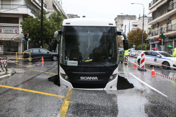 Λαχτάρισαν το πρωί οι επιβάτες λεωφορείου, όταν από την ισχυρή βροχόπτωση που πλήττει τη Θεσσαλονίκη υποχώρησε τμήμα οδοστρώματος επί της οδού Εθνικής Αντιστάσεως στην Καλαμαριά, με συνέπεια το μπροστινό μέρος του οχήματος να πέσει μέσα σε λακκούβα, βάθους 5 μέτρων!
