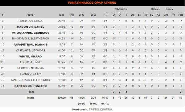 Για τους Πράσινους διασώθηκε με 18 πόντους ο Μέικον, ενώ 12 είχε ο Παπαγιάννης (6 ριμπάουντ) και 10 ο Πέρι.