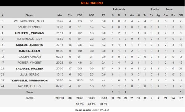 Ο μαγικός Ταβάρες μάζεψε 9 ριμπάουντ και είχε 17 πόντους με 5/5 δίποντα και 7/7 βολές, ενώ 16 πόντους σημείωσε ο Αμπάλδε (3/3 τρίποντα) και 14 ο Γιαμπουσέλε χωρίς προσπάθεια από τα 6,75μ. Διψήφιος και ο Πουαριέ για τους γηπεδούχους με 10 πόντους και 7 ριμπάουντ.
