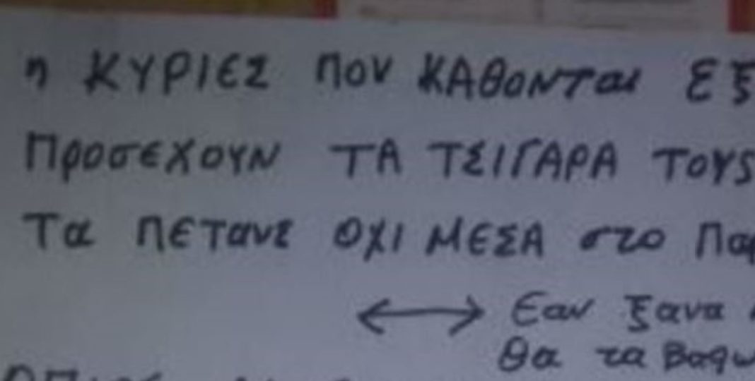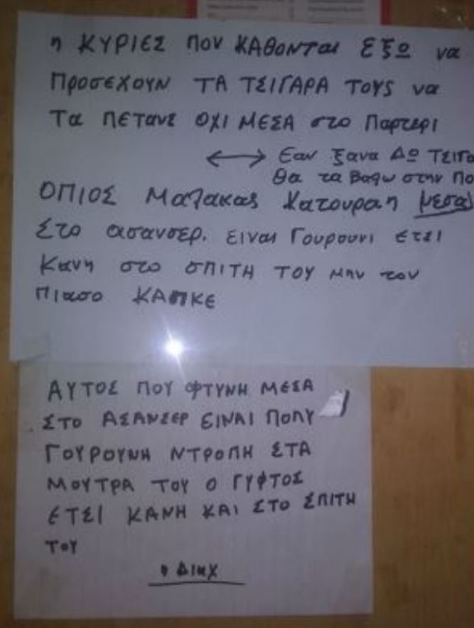 Είπε λοιπόν κι εκείνος να αναλάβει δράση και άρχισε τις απειλές (και τις βρισιές). Κάποιος, ένοικος πιθανότατα, φωτογράφισε τα σημειώματά του, τα ανέβασε στα social media και όπως ήταν φυσικό έγιναν viral.