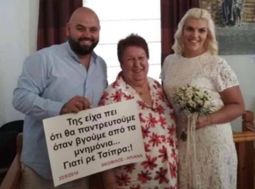 Στη φωτογραφία των νεόνυμφων με τη δήμαρχο της πόλης, ο γαμπρός κρατά πινακίδα που γράφει: «Της είχα πει ότι θα παντρευτούμε όταν βγούμε απ’ τα μνημόνια… Γιατί ρε Τσίπρα;!».