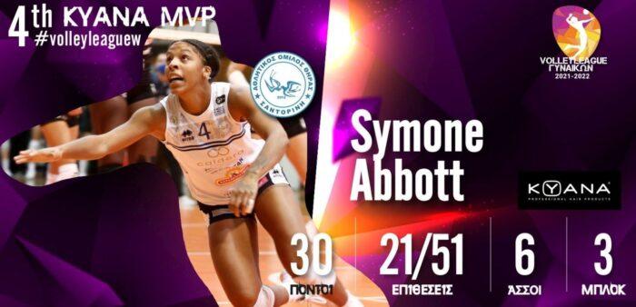 Η Σιμόν Άμποτ είναι η KYANA MVP της 4ης αγωνιστικής του πρωταθλήματος της Volley League Γυναικών. Η Αμερικανίδα ακραία με 30 πόντους (21/51 επ., 6 άσσοι, 3 μπλοκ, 62% υπ. – 32% άριστες) ήταν η κορυφαία στη νίκη του Α.Ο. Θήρας με 3-2 σετ επί της Θέτιδας Βούλας.